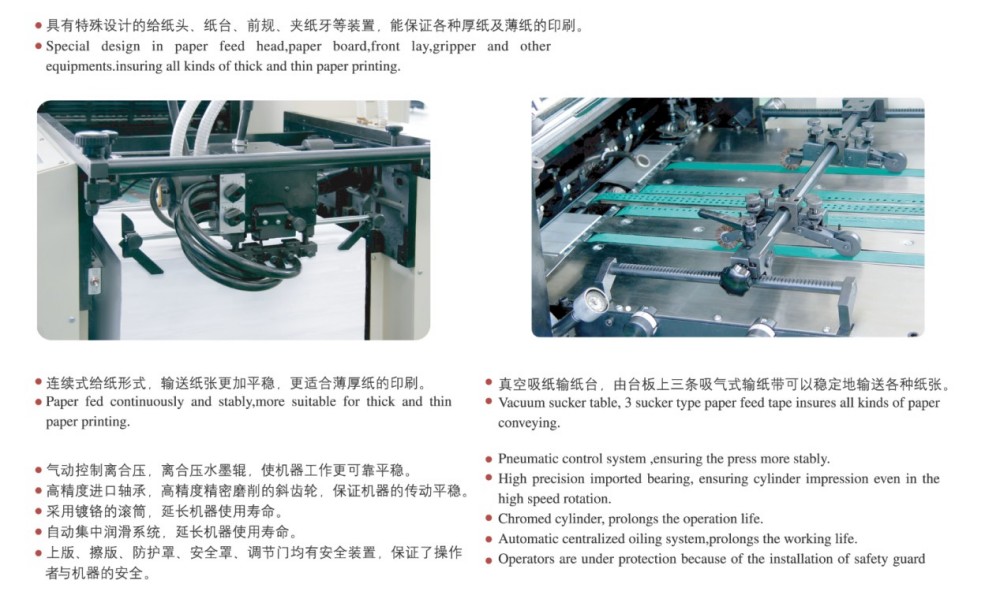 Khi nói đến Máy in offset tốc độ ngắn bốn màu A2, nó được xây dựng với các mô-đun hiệu suất cao giúp máy trở nên đáng tin cậy—hoàn hảo cho các tác vụ in ngắn hạn. Các mô-đun này bao gồm các con lăn và bánh răng có độ chính xác cao, cơ chế nạp giấy chắc chắn, hệ thống đăng ký giấy chính xác và hệ thống cung cấp mực ổn định. Nó đáp ứng nhu cầu của thị trường về in màu theo tờ rời với chất lượng cao, hiệu quả và tiết kiệm chi phí, đặc biệt đối với các công việc ngắn hạn. Nó có thể xử lý nhiều loại giấy có độ dày khác nhau—từ giấy mỏng 0,04mm đến bìa cứng dày 0,4mm. Và với điều khiển bằng màn hình cảm ứng và giao diện lập trình trực quan, bạn có thể dễ dàng thực hiện các điều chỉnh thông minh đối với tất cả các cài đặt và thông số in.
