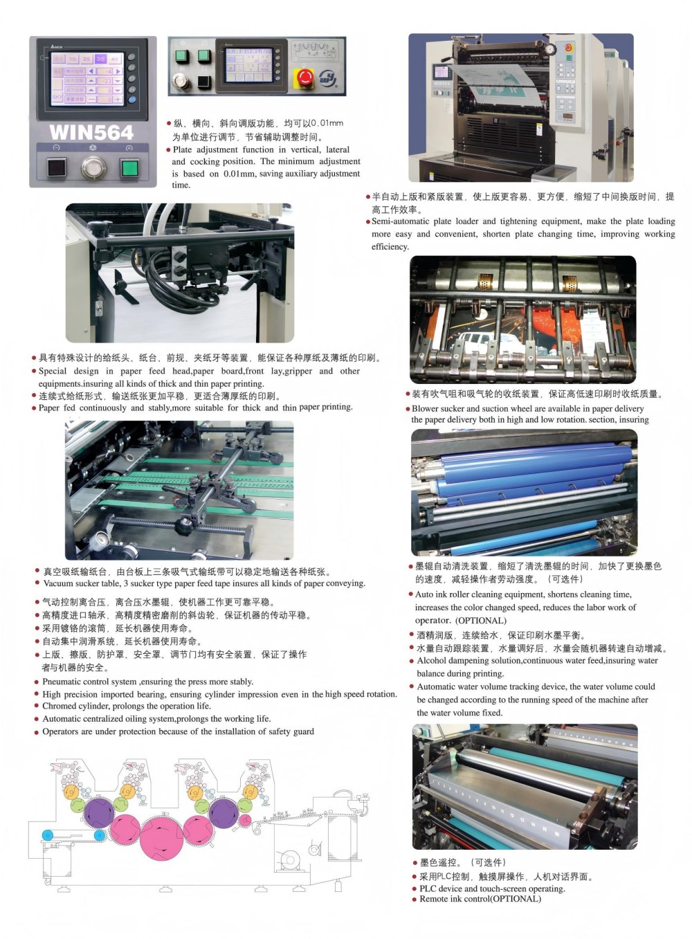 Máy in offset nhãn bốn màu A2 được thiết kế với các mô-đun hiệu suất cao và tất cả đều là chất lượng hàng đầu—con lăn và bánh răng có độ chính xác cao, cơ chế nạp giấy mạnh mẽ, hệ thống đăng ký giấy có độ chính xác cao và hệ thống cung cấp mực ổn định. Nó được thiết kế để đáp ứng các yêu cầu của thị trường về in màu theo tờ rời với chất lượng cao, hiệu quả và giá cả phải chăng. Bạn cũng không cần phải tuân theo chỉ một độ dày giấy—nó hoạt động với giấy mỏng (0,04mm) cho đến bìa cứng dày (0,4mm). Ngoài ra còn có điều khiển màn hình cảm ứng với giao diện lập trình trực quan, cho phép bạn điều chỉnh cài đặt và thông số in một cách thông minh, đơn giản.