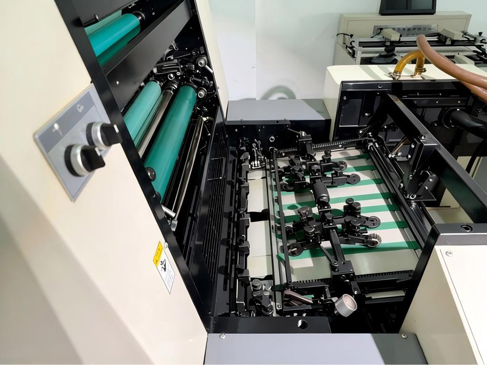 11) Cơ chế nạp giấy cánh tay đòn đảm bảo máy ép chạy ổn định và trơn tru khi in tốc độ cao.