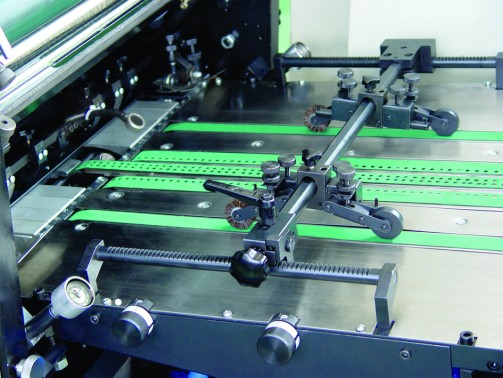3. Máy ép có một mô-đun nạp giấy liên tục được kết nối với bàn hút chân không trên đó lắp đặt ba băng tải vận chuyển giấy quay. Hệ thống vận chuyển giấy như vậy có thể vận chuyển đáng tin cậy nhiều loại giấy có độ dày rộng.