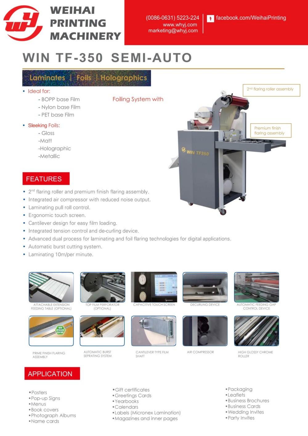 Máy ép màng và ép kim loại nạp giấy thủ công là thiết bị cán màng và ép kim loại nạp giấy thủ công được thiết kế và sản xuất bởi Weihai Printing Machinery Co., Ltd. Với thiết kế nhỏ gọn, giúp tiết kiệm không gian xưởng đồng thời tích hợp cả chức năng cán màng và tráng kim loại, phù hợp cho các doanh nghiệp yêu cầu gia công trang trí nội bộ. Nó có thể chuyển đổi các vật liệu in thông thường thành các sản phẩm hoàn thiện tinh xảo cao cấp và hoàn toàn tương thích với cả ứng dụng kỹ thuật số theo yêu cầu và các bản in offset in thạch bản truyền thống. Để đảm bảo kết quả xử lý tối ưu, máy được trang bị thiết bị điều khiển điện tử giúp điều chỉnh áp suất con lăn và nhiệt độ gia nhiệt trong quá trình vận hành theo các thông số chính như tốc độ chạy, độ dày giấy và mẫu thiết kế. Là thiết bị cán nóng và ép nóng cấp liệu thủ công hiệu suất cao, nó đã được chứng minh là có khả năng nâng cao đáng kể giá trị gia tăng cho sản phẩm của khách hàng. Khách hàng có thể lựa chọn từ nhiều loại màng cán và lá kim loại để đáp ứng các yêu cầu trang trí đa dạng. Hơn nữa, nó còn được trang bị một bàn nạp giấy mở rộng để chứa các biểu ngữ và tài liệu in cực dài.